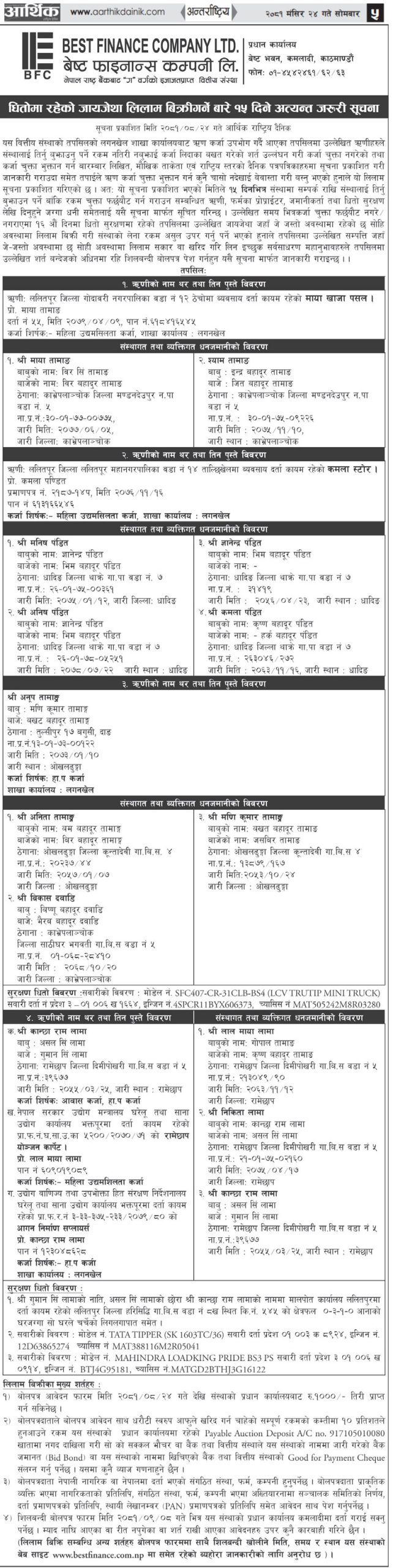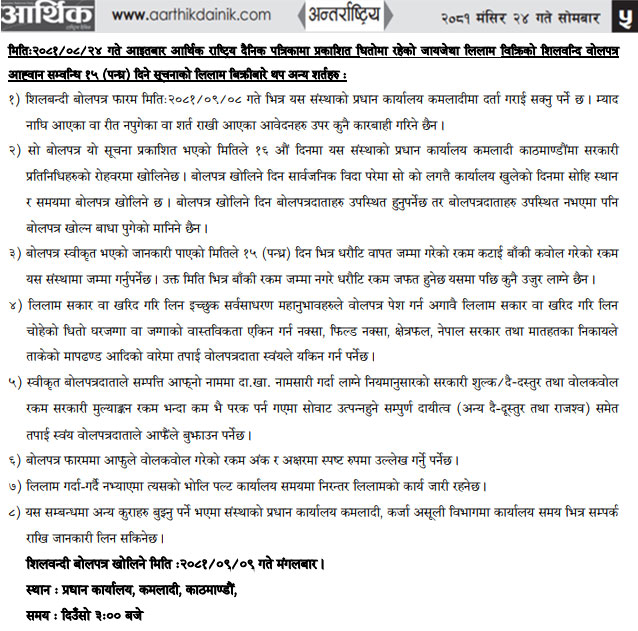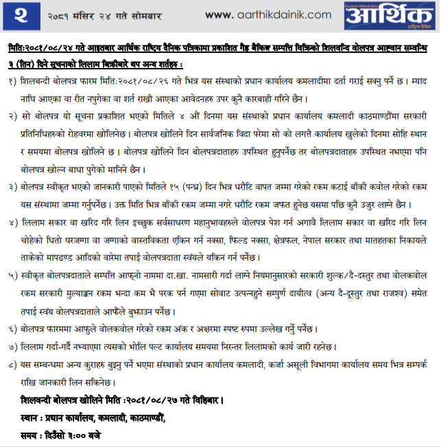 धितोमा रहेको जायजेथा लिलाम बिक्री गर्नेबारे १५ दिने अत्यन्त जरुरी सूचनाको अन्य शर्तहरु (Published in Arthik National Daily)