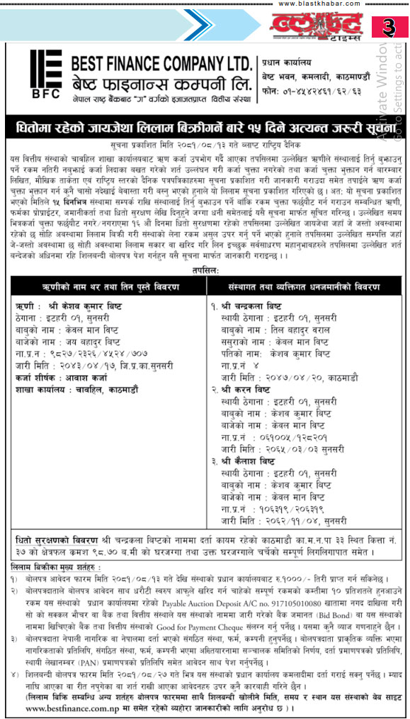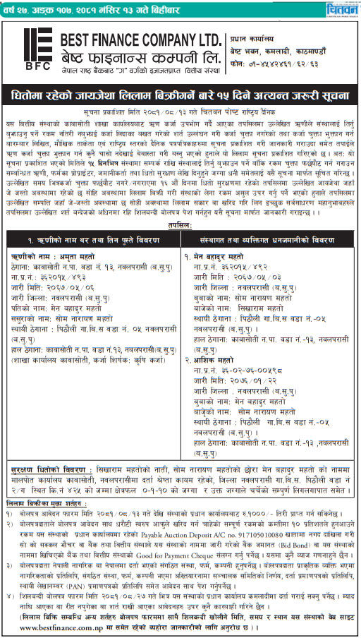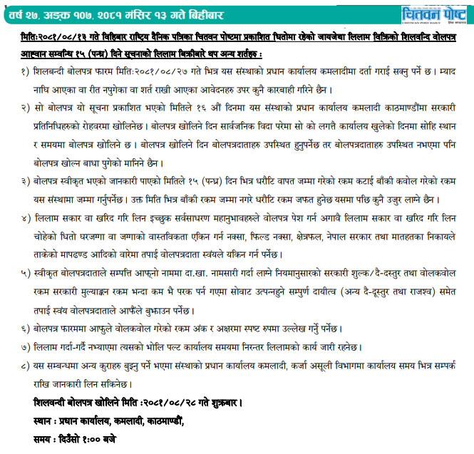 धितोमा रहेको जायजेथा लिलाम बिक्री गर्नेबारे १५ दिने अत्यन्त जरुरी सूचनाको अन्य शर्तहरु (Published in Chitwan Post National daily)