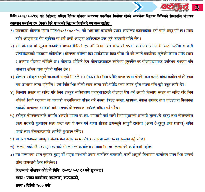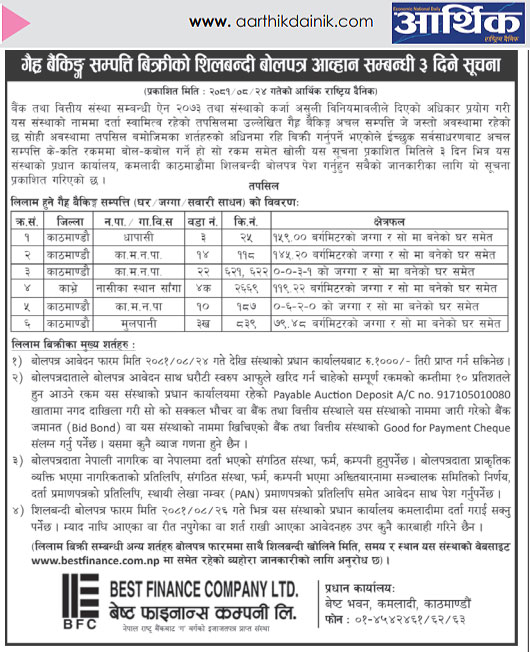 धितोमा रहेको जायजेथा लिलाम बिक्री गर्नेबारे ३ दिने अत्यन्त जरुरी सूचनाको अन्य शर्तहरु (Published in Arthik National Daily)