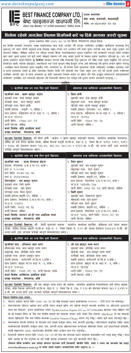 धितोमा रहेको जायजेथा लिलाम बिक्री गर्नेबारे १५ दिने अत्यन्त जरुरी सूचनाको अन्य शर्तहरु (Published in Dainik Nepalgunj)