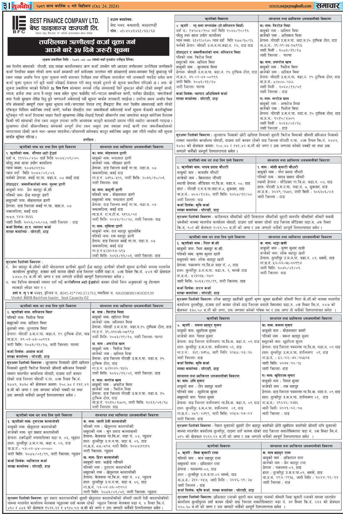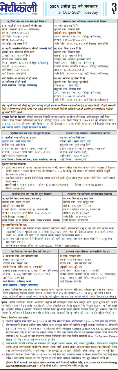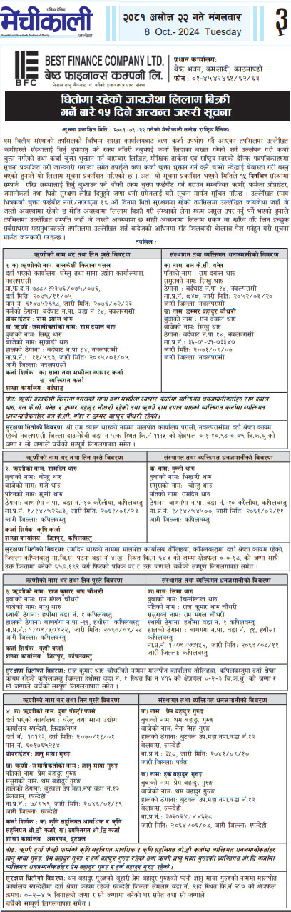 २०८१-०६-२२ गते मंगलबार राष्ट्रिय दैनिक पत्रिका मेची महाकाली मा प्रकाशित धितोमा रहेको जायजेथा लिलाम बिक्री गर्नेबारे १५ दिने अत्यन्त जरुरी सूचना (पृष्ठ१)
