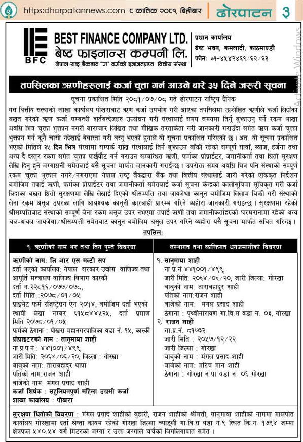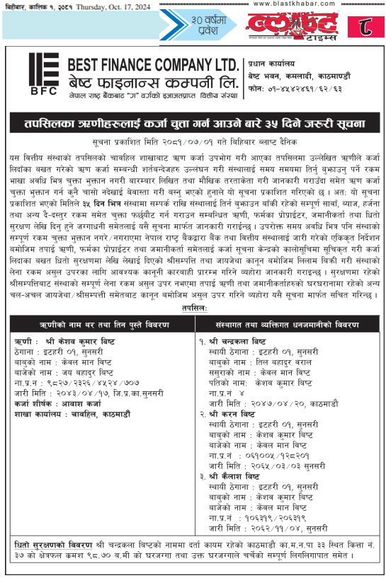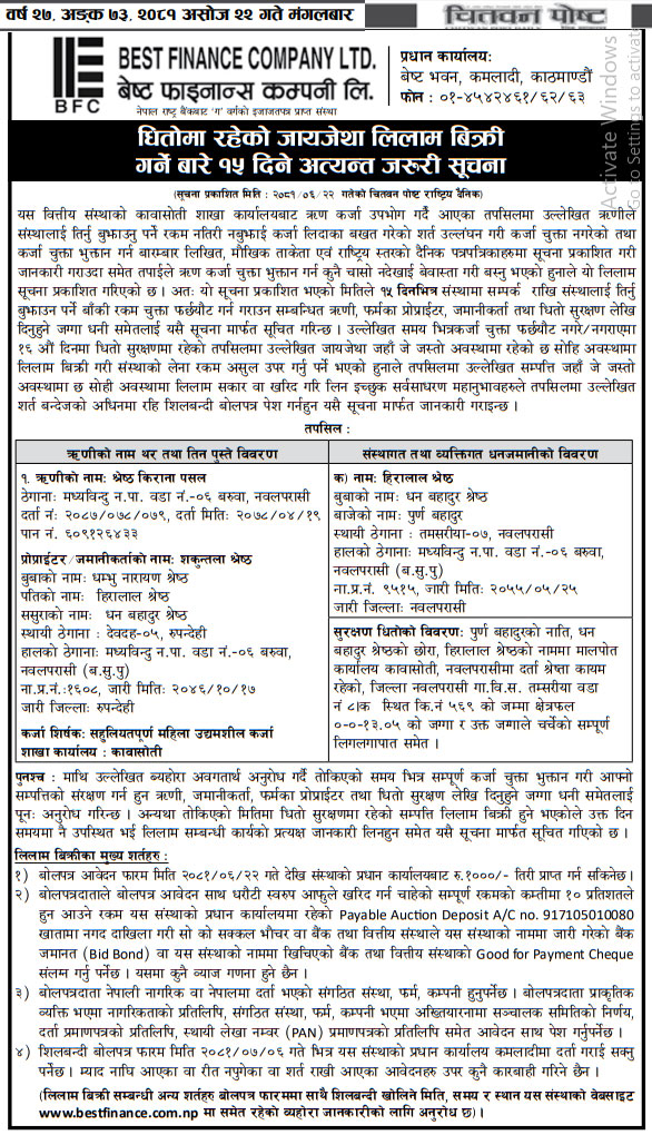 २०८१-०६-२२ गते मंगलबार राष्ट्रिय दैनिक पत्रिका दैनिक चितवन पोष्टमा प्रकाशित धितोमा रहेको जायजेथा लिलाम बिक्री गर्नेबारे १५ दिने अत्यन्त जरुरी सूचना