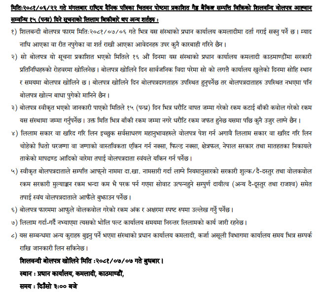 २०८१-०६-२२ गते मंगलबार राष्ट्रिय दैनिक पत्रिका दैनिक चितवन पोष्टमा प्रकाशित धितोमा रहेको जायजेथा लिलाम बिक्री गर्नेबारे १५ दिने अत्यन्त जरुरी सूचनाका थप अन्य शर्तहरु