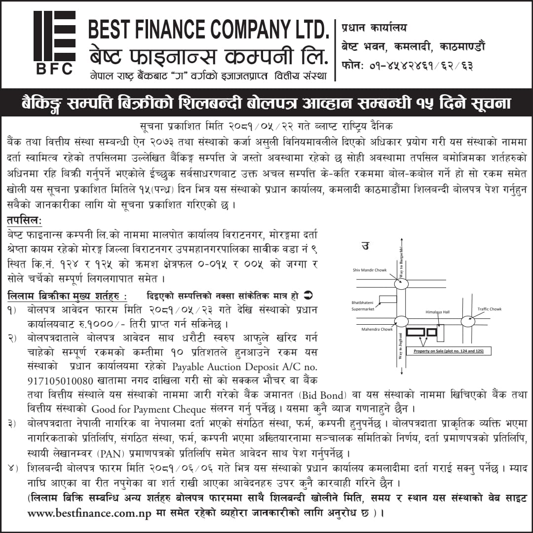 बैंकिङ्ग सम्पति बिक्रीको शिल्बन्दी बोल्पत्र आव्हान सम्बन्धि १५ दिने सुचना as published on Blast National Daily