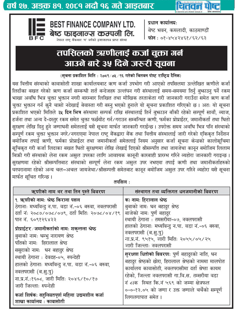 ३५ दिने जरुरी सूचना Published In Chitwan Post Daily