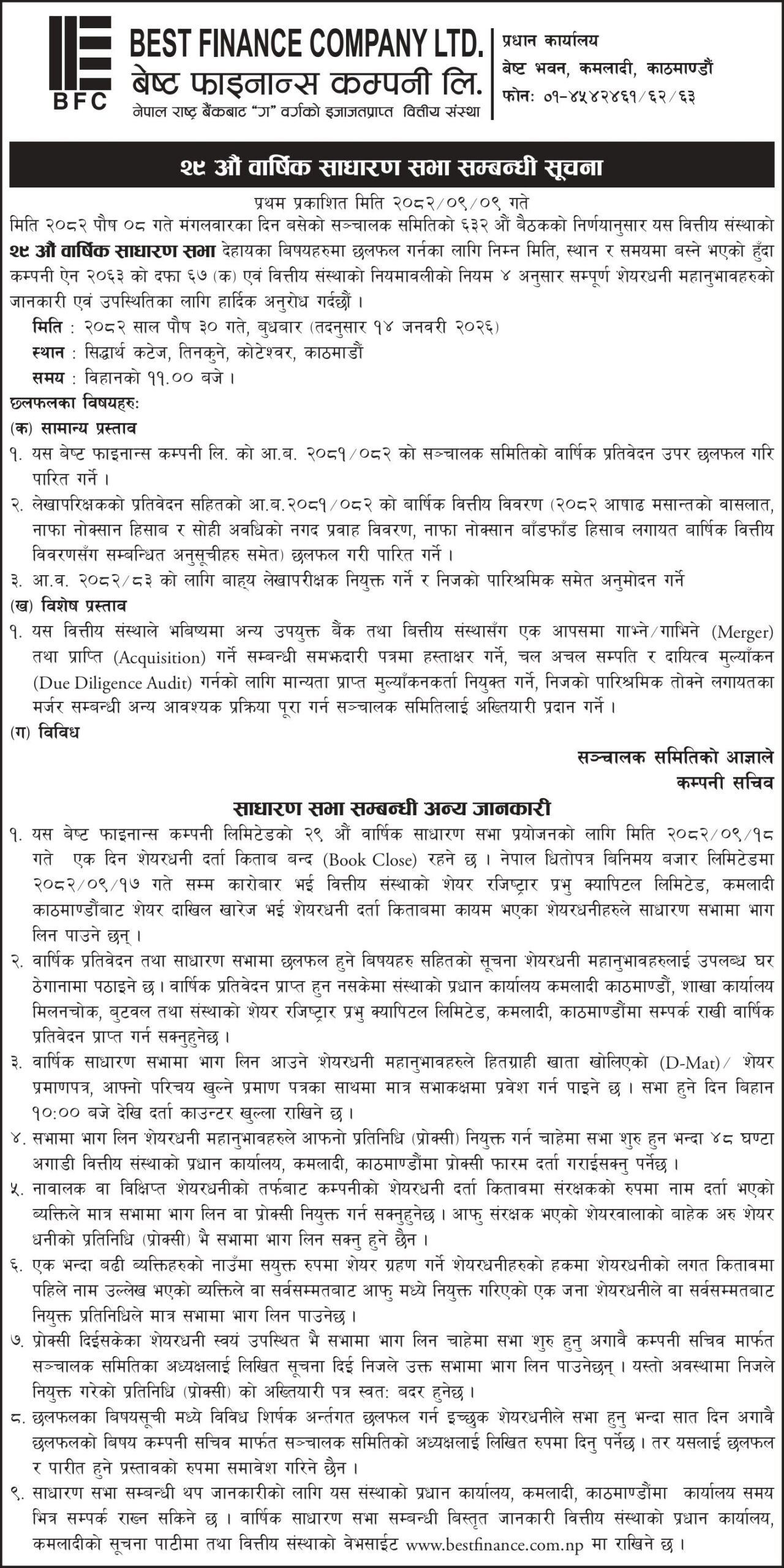 २९ औं बार्षिक साधारण सभा सम्बन्धी सूचना