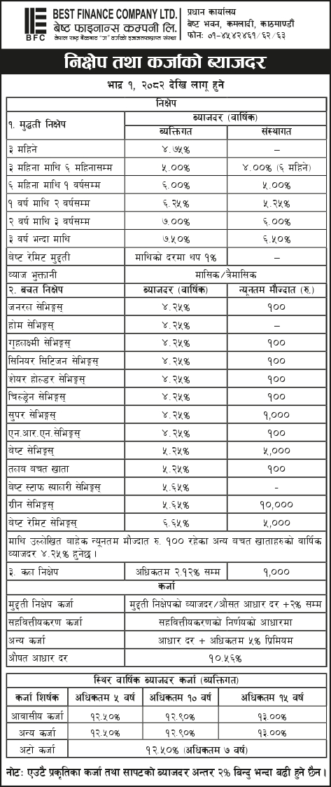 भाद्र १, २०८२ देखि लागू हुने ब्याजदरहरू