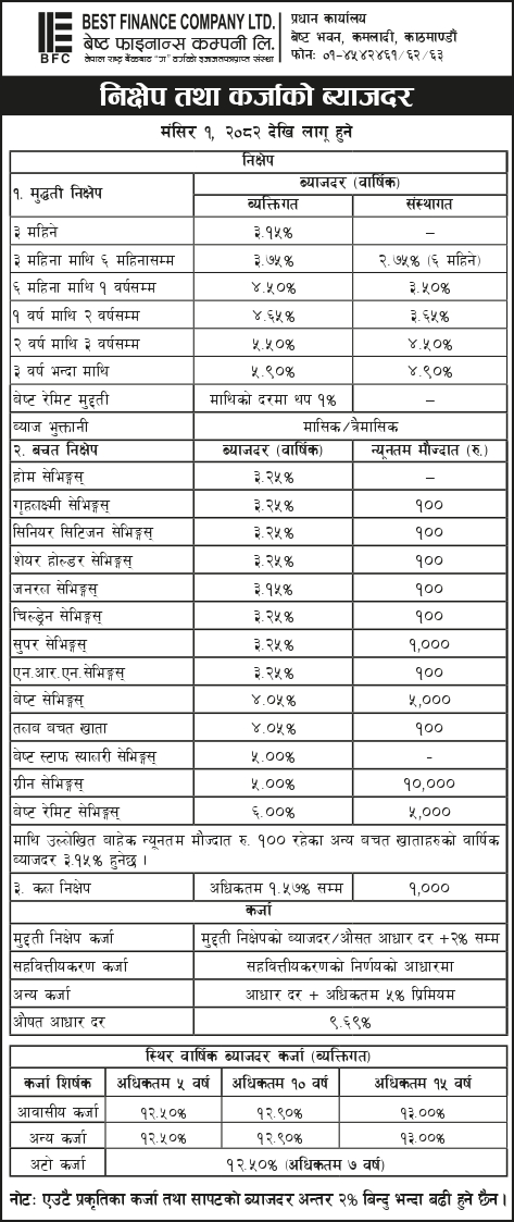 मंसिर १, २०८२ देखि लागू हुने ब्याजदरहरू