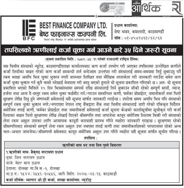 ऋणिलाई कर्जा चुक्ता गर्न आउने बारे ३५ दिने जरुरी सुचना