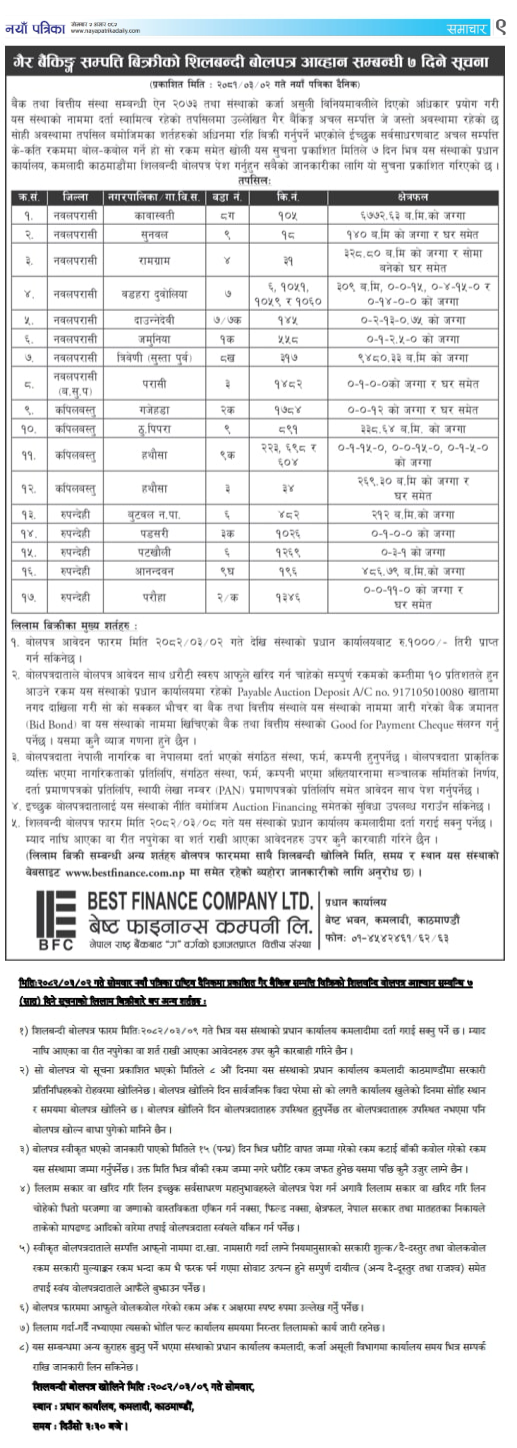 गैर बैंकिङ्ग सम्पत्ति बिक्रीको शिलबन्दी बोलपत्र आव्हान सम्बन्धी ७ दिने सुचना (नयाँ पत्रिकामा प्रकाशित)