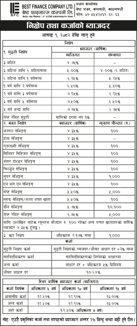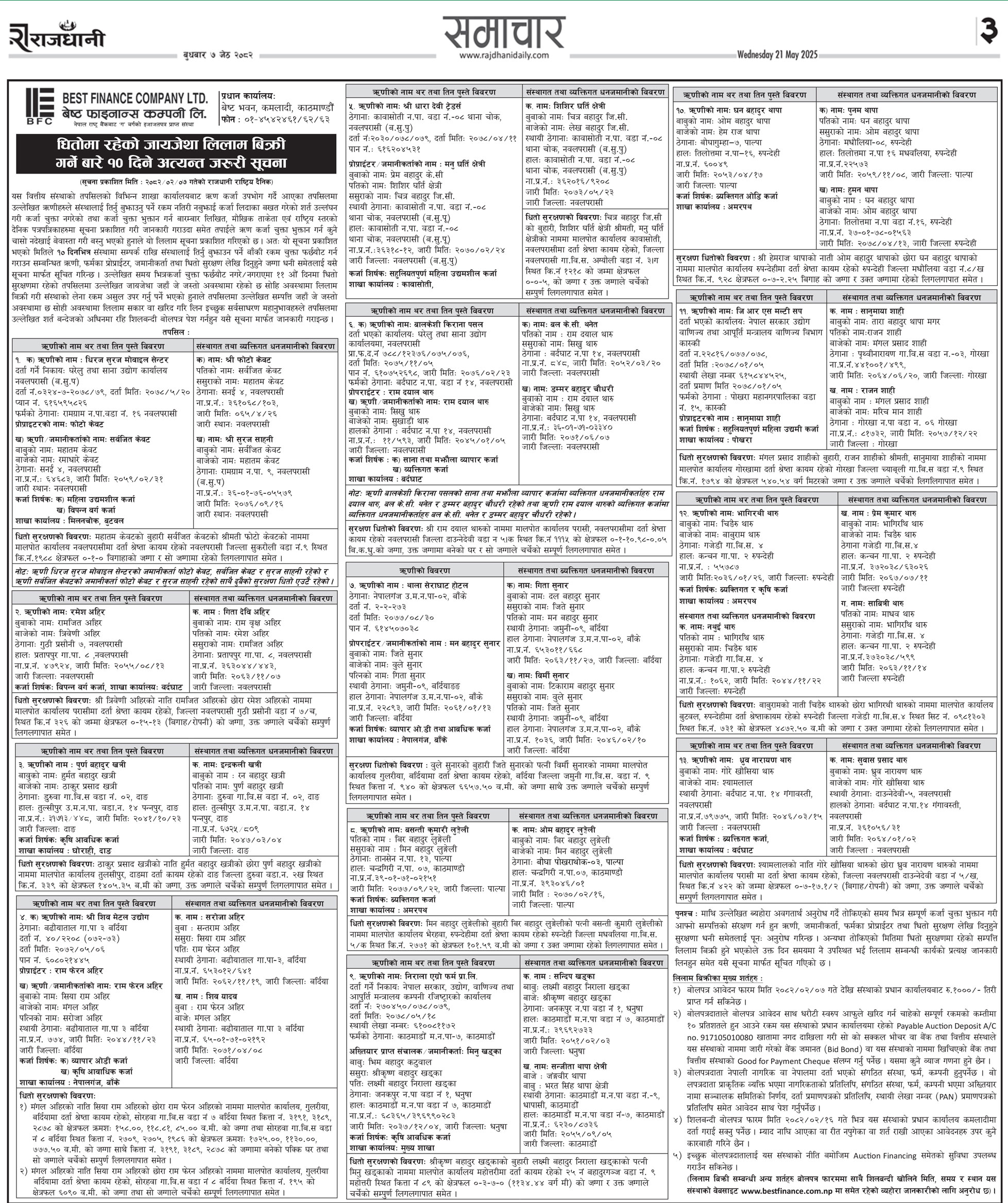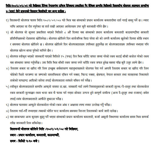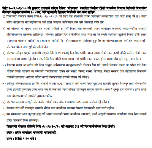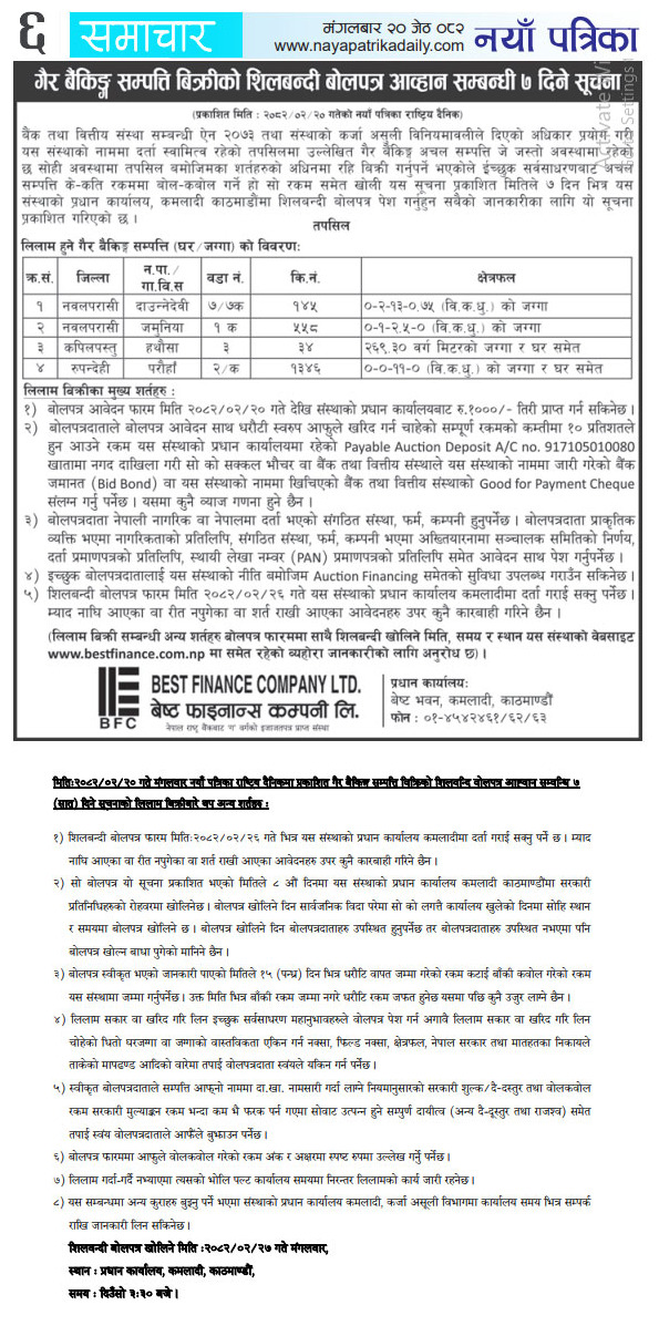 मिति: २०८२/०२/०१ गते बिहीबार दैनिक नेपालगंज राष्ट्रिय दैनिकमा प्रकाशित गैर बैंकिङ्ग सम्पत्ति बिक्रीको शिलबन्दी बोलपत्र आव्हान सम्बन्धी ७ दिने सूचनाको लिलाम बिक्रीबारे थप अन्य शर्तहरु