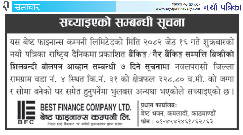 २०८२ जेठ १६ गते शुक्रबारको नयाँ पत्रिका राष्ट्रिय दैनिकमा प्रकाशित बैंकिङ्ग / गैर बैंकिङ्ग सम्पत्ति बिक्रीको शिलबन्दी बोलपत्र आव्हान सम्बन्धी ७ दिने सूचना सच्याइएको सम्बन्धी सुचना