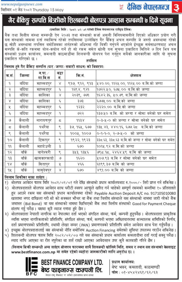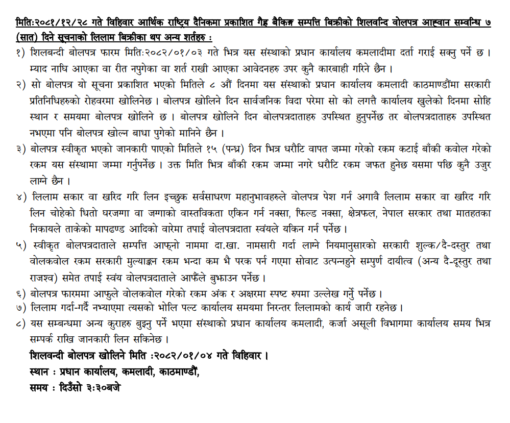मिति: २०८१/१२/२८ गते आर्थिक राष्ट्रिय दैनिकमा प्रकाशित गैर बैंकिङ सम्पत्ति बिक्रीको शिलबन्दी बोलपत्र आव्हान सम्बन्धी ७ दिने सुचनाका थप अन्य शर्तहरु