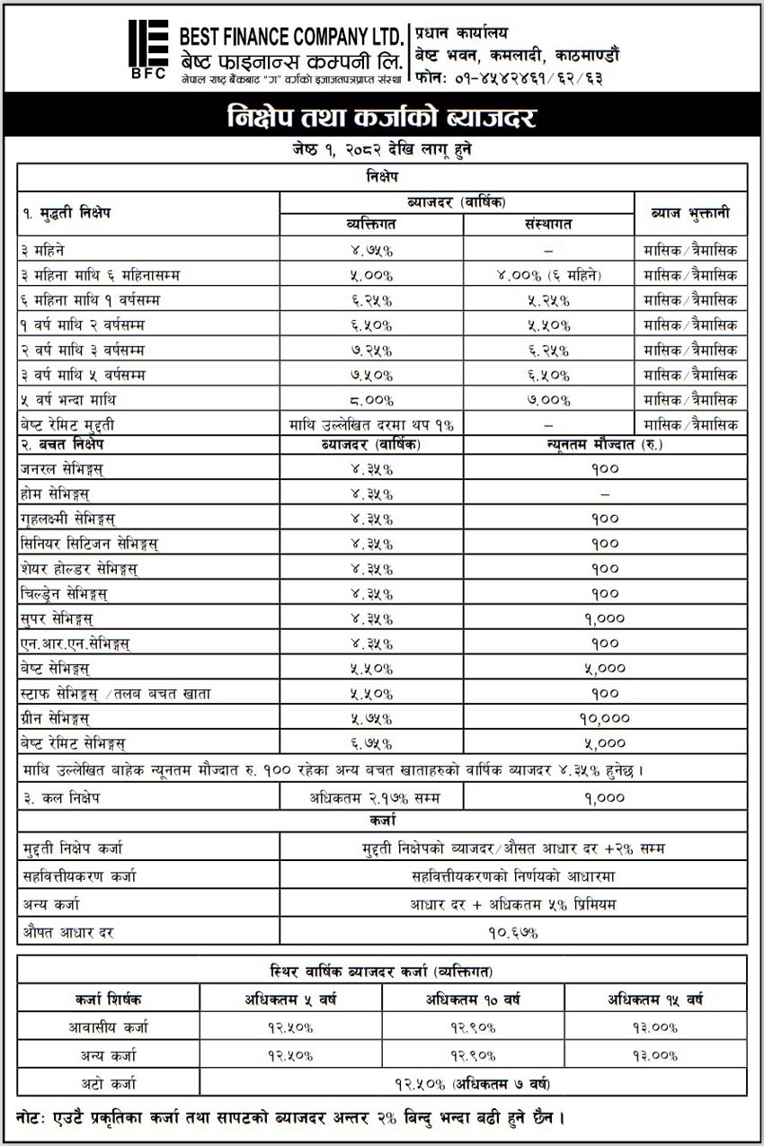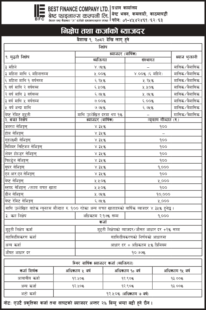 २०८२ वैशाख १ गतेदेखि लागू हुने ब्याजदर