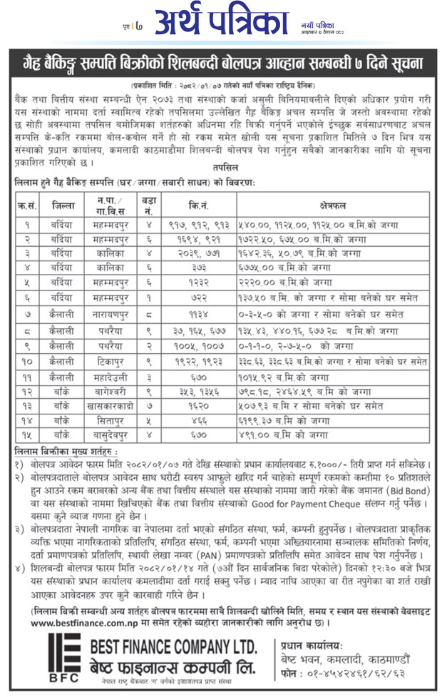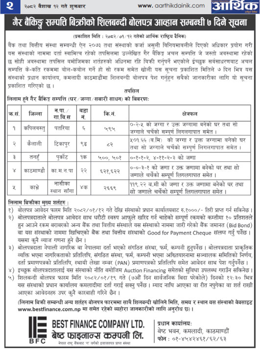 मिति: २०८२/१/७ गते आर्थिक राष्ट्रिय दैनिकमा प्रकाशित गैर बैंकिङ सम्पत्ति बिक्रीको शिलबन्दी बोलपत्र आव्हान सम्बन्धी ७ दिने सुचना