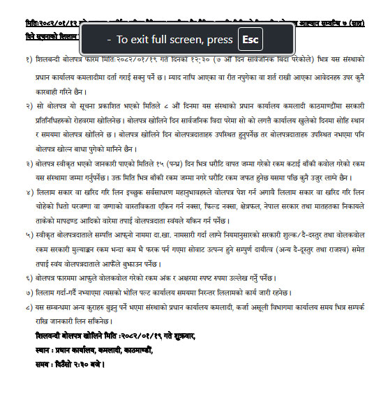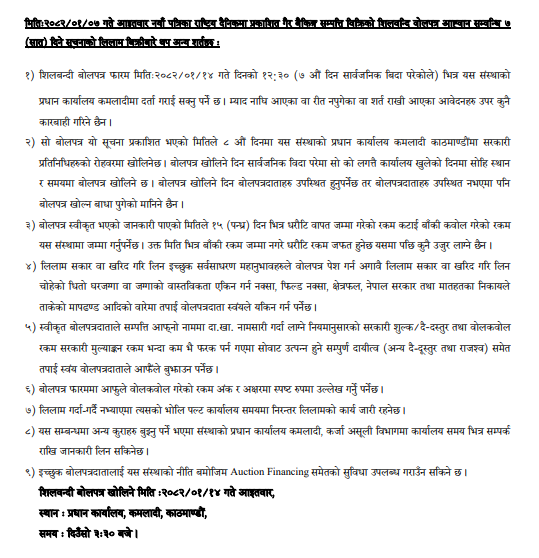 मिति: २०८२/०१/१२ गते आर्थिक राष्ट्रिय दैनिकमा प्रकाशित गैर बैंकिङ सम्पत्ति बिक्रीको शिलबन्दी बोलपत्र आव्हान सम्बन्धी ७ दिने सुचनाका थप अन्य शर्तहरु