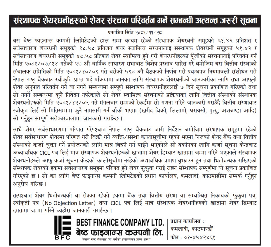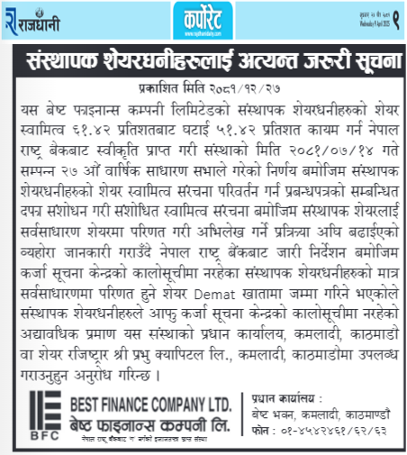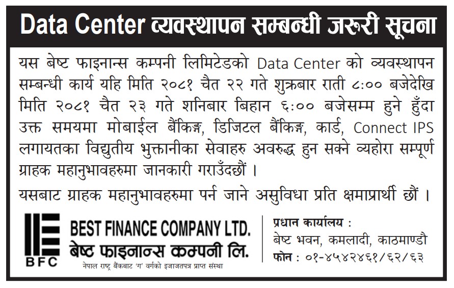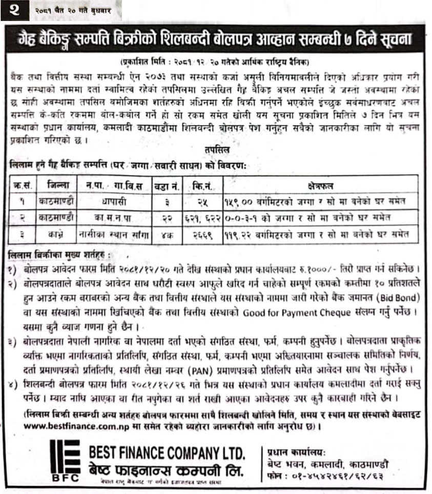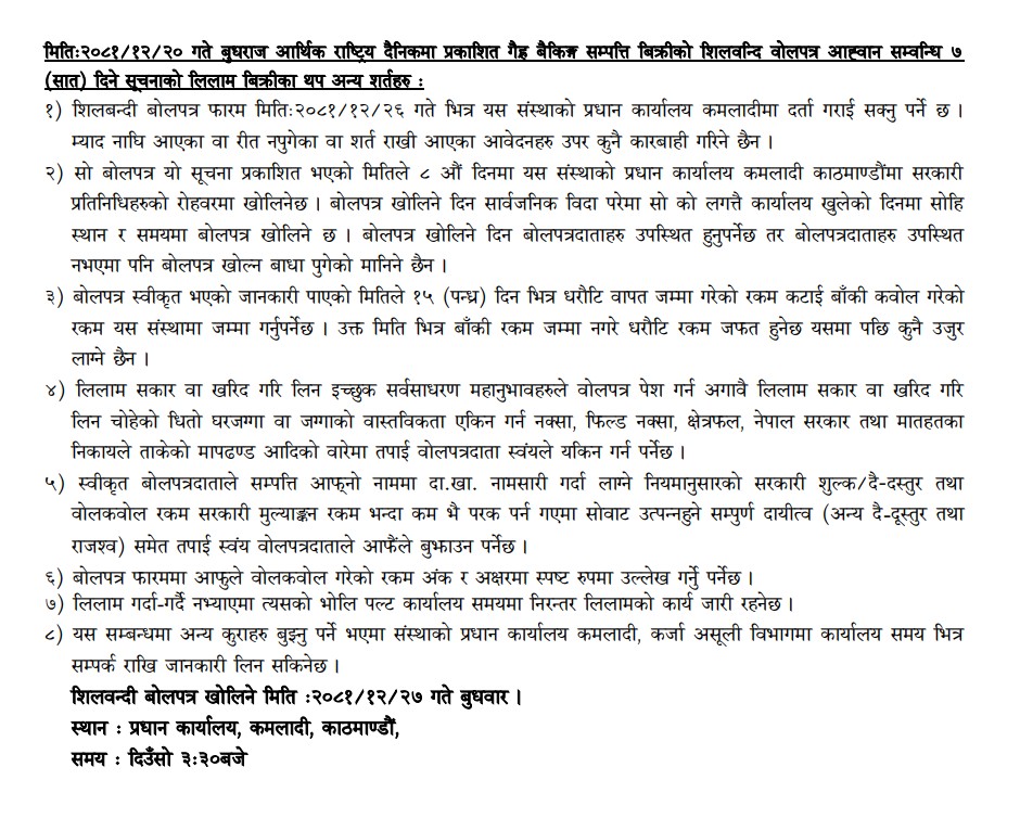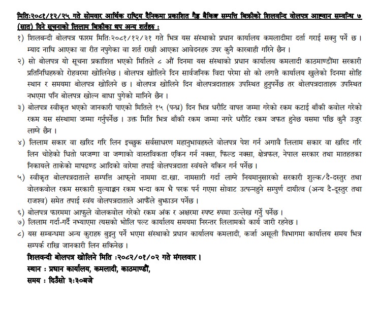 मिति: २०८१/१२/२५ गते सोमबार आर्थिक राष्ट्रिय दैनिकमा प्रकाशित गैर बैंकिङ सम्पत्ति बिक्रीको शिलबन्दी बोलपत्र आव्हान सम्बन्धी ७ दिने सुचनाका थप अन्य शर्तहरु