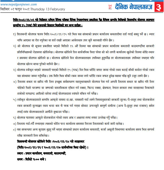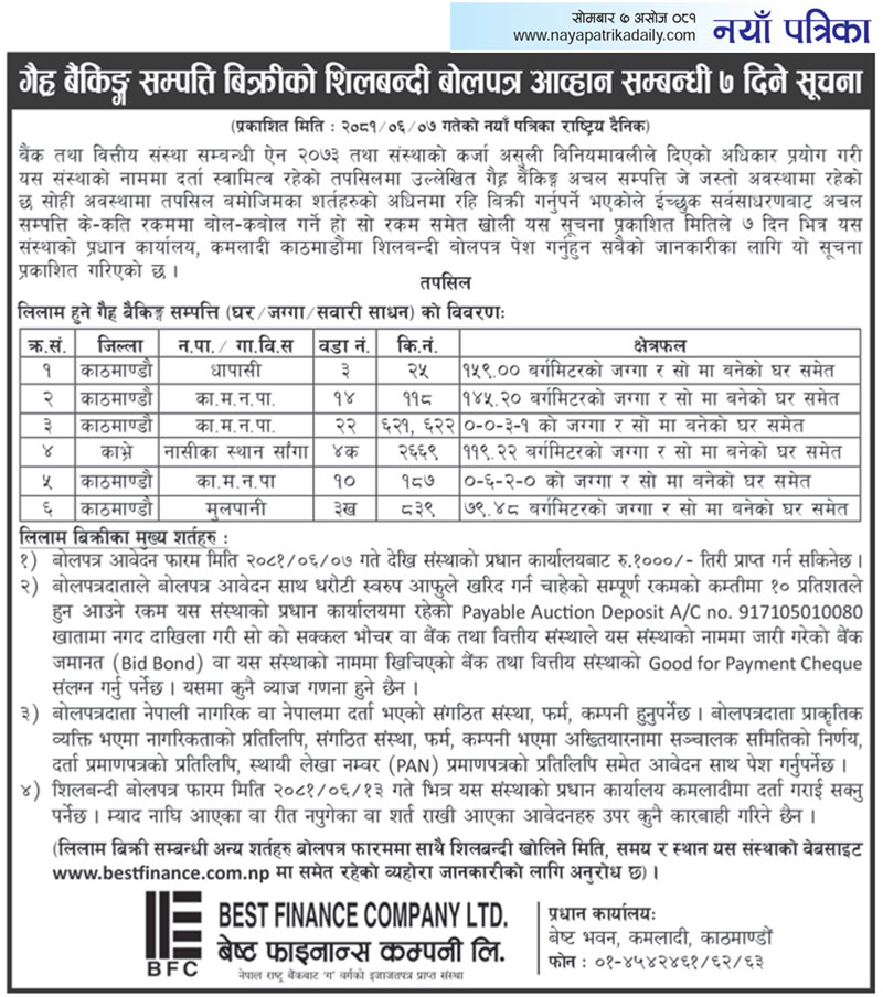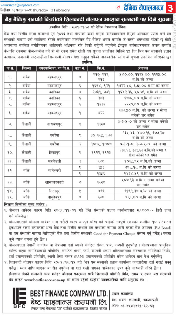 गैर बैंकिङ लिलाम बिक्री गर्नेबारे १५ दिने अत्यन्त जरुरी सूचनाका थप अन्य शर्तहरु