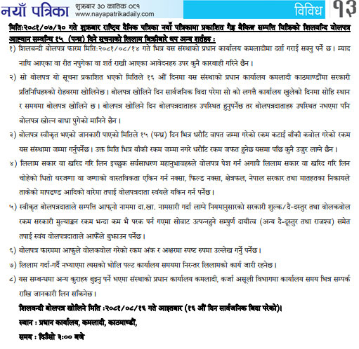 गैर बैंकिङ लिलाम बिक्री गर्नेबारे १५ दिने अत्यन्त जरुरी सूचना (In Naya Yugbodh National Daily)
