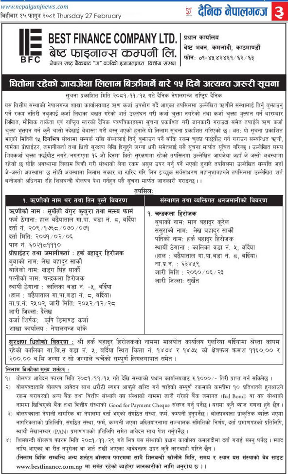 गैर बैंकिङ लिलाम बिक्री गर्नेबारे १५ दिने अत्यन्त जरुरी सूचना (In Dainik Nepalgunj National Daily)