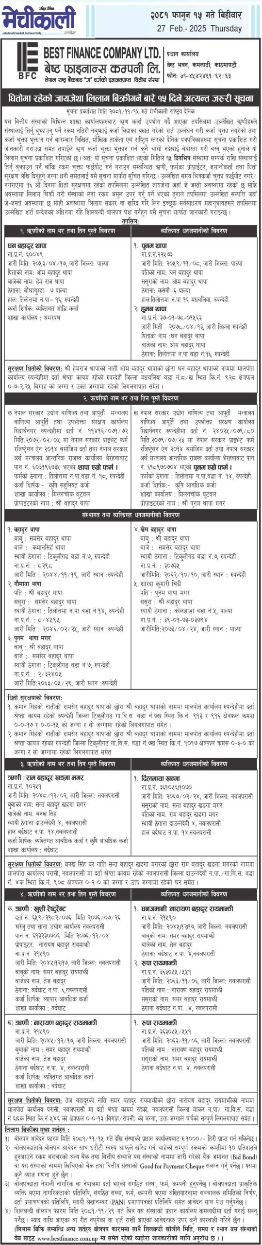 गैर बैंकिङ लिलाम बिक्री गर्नेबारे १५ दिने अत्यन्त जरुरी सूचना